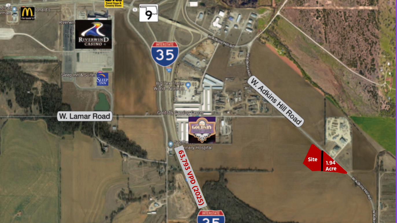 | Located just 1 mile from I-35 and 1.5 miles from Riverwind Casino, this 3.2-acre industrial-zoned tract sits on Adkins Hill Road within the City of Goldsby and carries a Norman address. Positioned in a growing industrial corridor with high traffic exposure—over 63,000 vehicles per day on I-35 and 24,000 on Highway 9—the property offers excellent development potential. City water is available, and the City of Goldsby is actively working on plans to extend sewer service to the area, enhancing long-term value. This is a prime opportunity for industrial users, service-based businesses, or investors seeking land in a strategic and expanding location ***Seller financing available.*** | ||